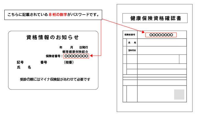 ログイン ご利用いただくためには、「資格情報のお知らせ」または「資格確認書」、マイナポータルに記載されている8桁の数字(保険者番号)の入力が必要です。 ①「資格情報のお知らせ」で確認 皆様にお送りしている「資格情報のお知らせ」に記載されています(赤枠部分)。 ②「資格確認書」で確認 マイナ保険証をお持ちでない方にお送りしている「資格確認書」に記載されています(赤枠部分)。 ③ マイナポータルで確認 マイナポータルにログイン後、トップ画面にある「健康保険証」内に記載されています。 パスワードを保存